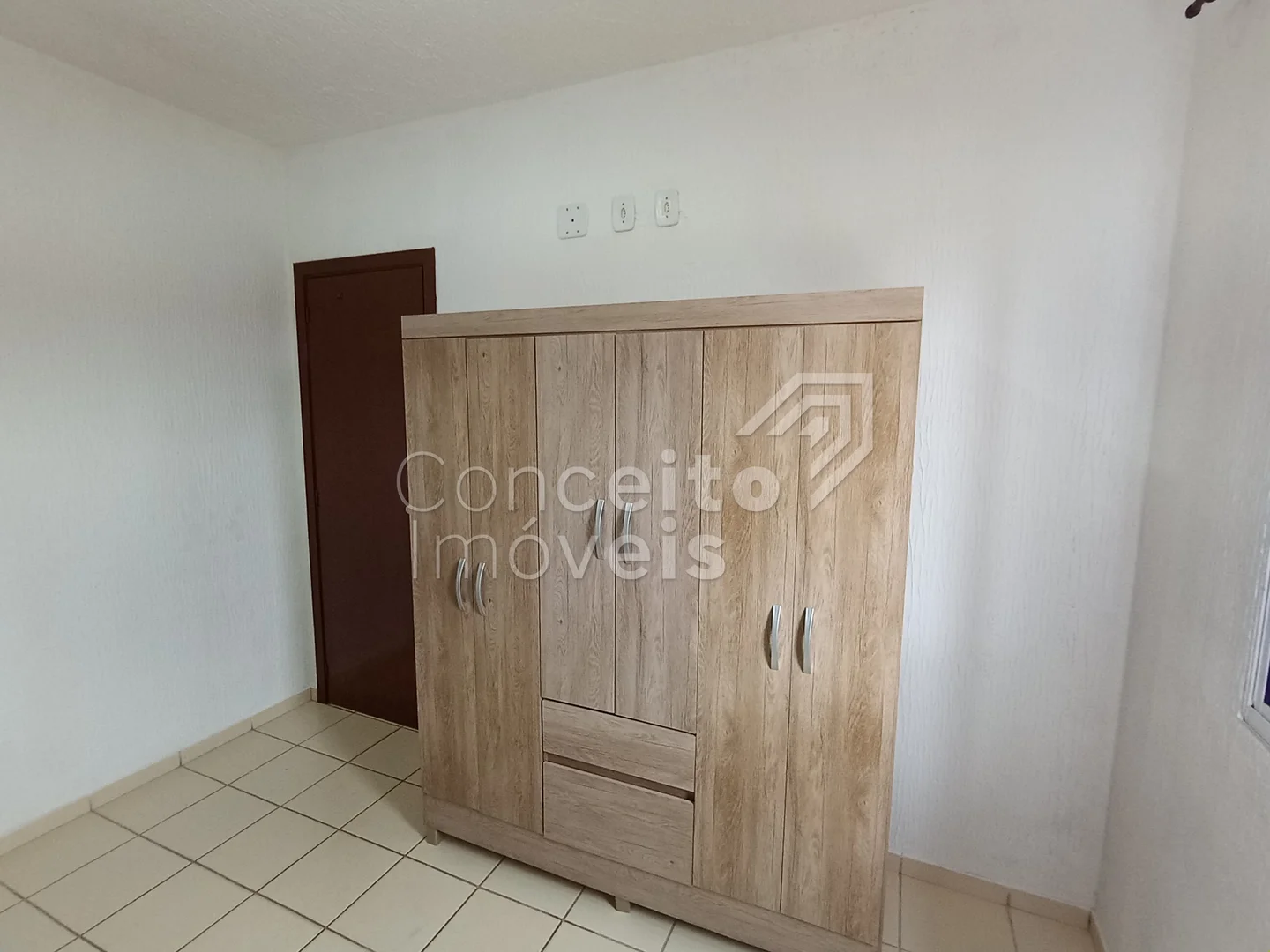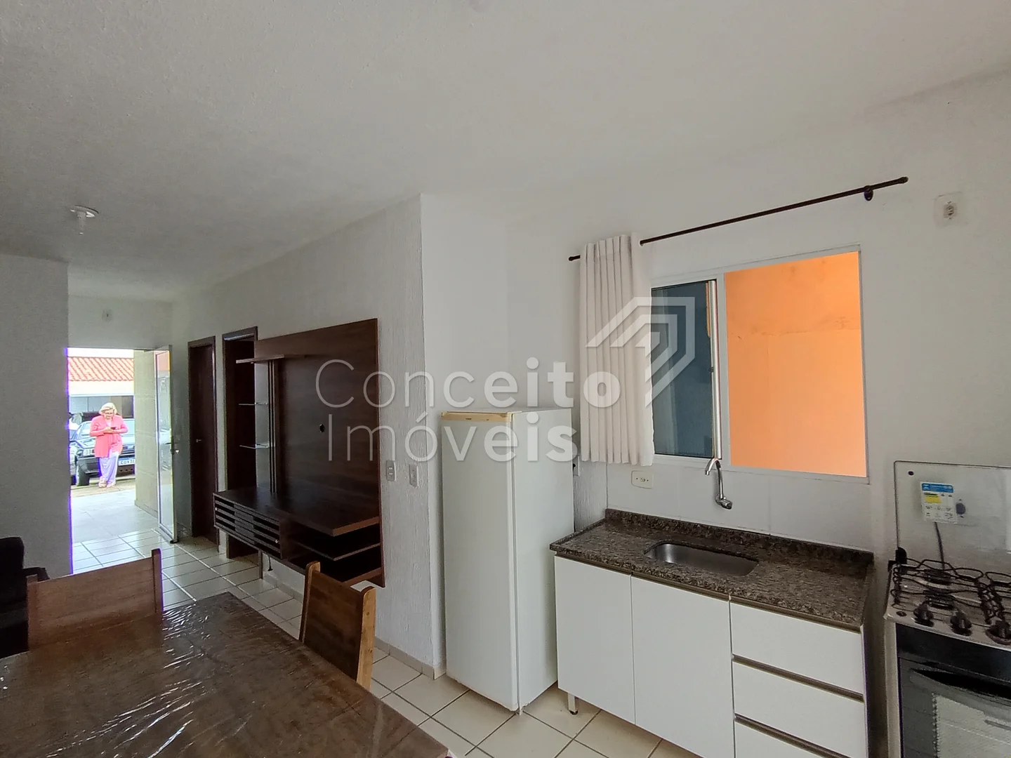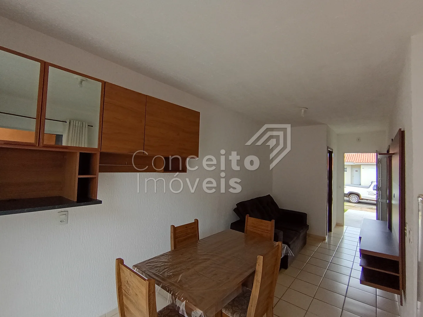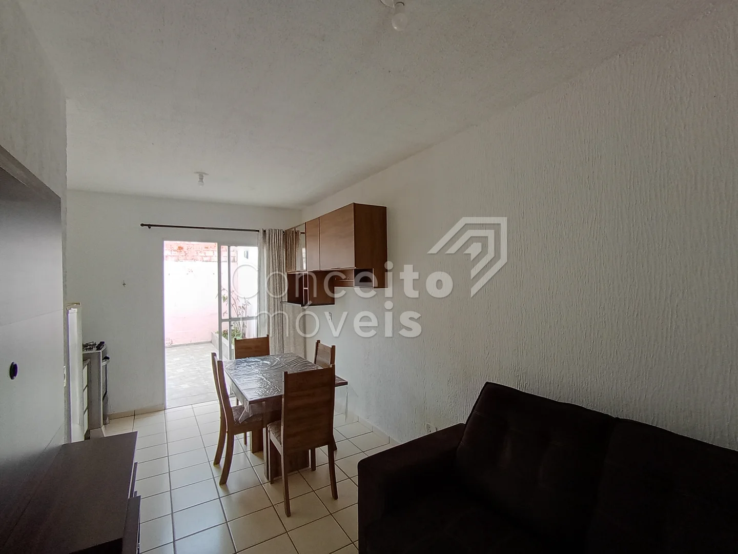 Residência semi mobiliada em condomínio fechado. Contendo cozinha com pia, armários, fogão geladeira e mesa de jantar, sala para dois ambientes com sofá e painel para a TV, banheiro com box e armário, dois quartos com cama e guarda roupa, área de serviço coberta com máquina de lavar, 1 vaga de garagem.