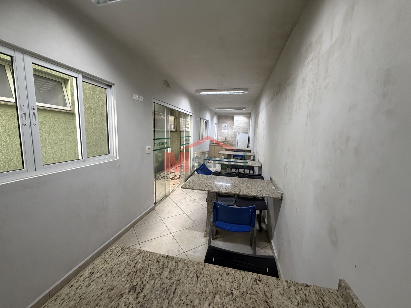 Lado esquerdo com sala ampla com palco, ideal para eventos, treinamentos ou apresentações.