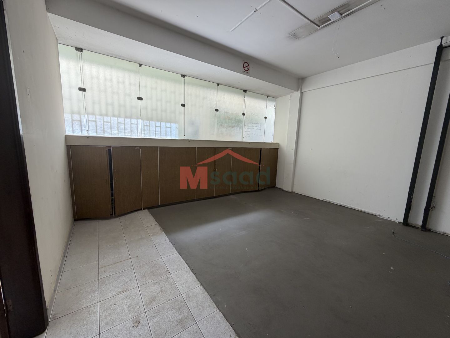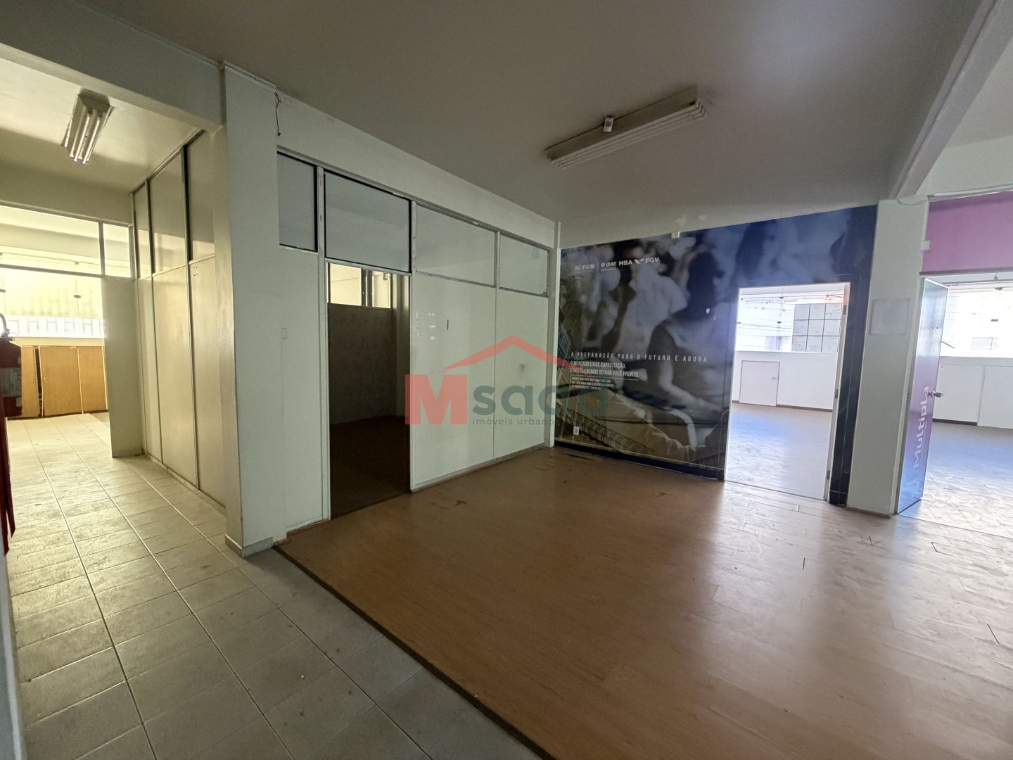 Lado direito com ambiente amplo com divisórias, formando salas menores, além de armários embutidos e banheiros masculino e feminino.