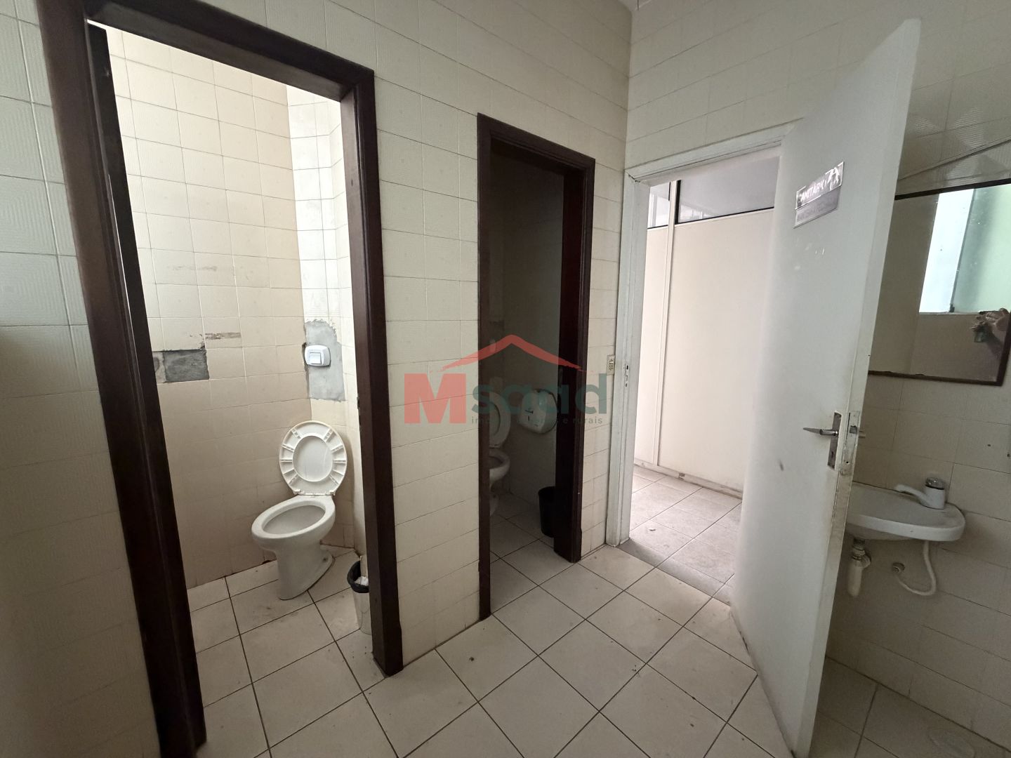 Lado direito com sala ampla, contendo banheiro individual e banheiros masculino e feminino.
