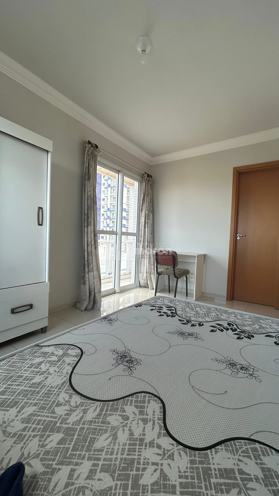 - Suíte com cama casal box, guarda roupas 2 portas, cortina