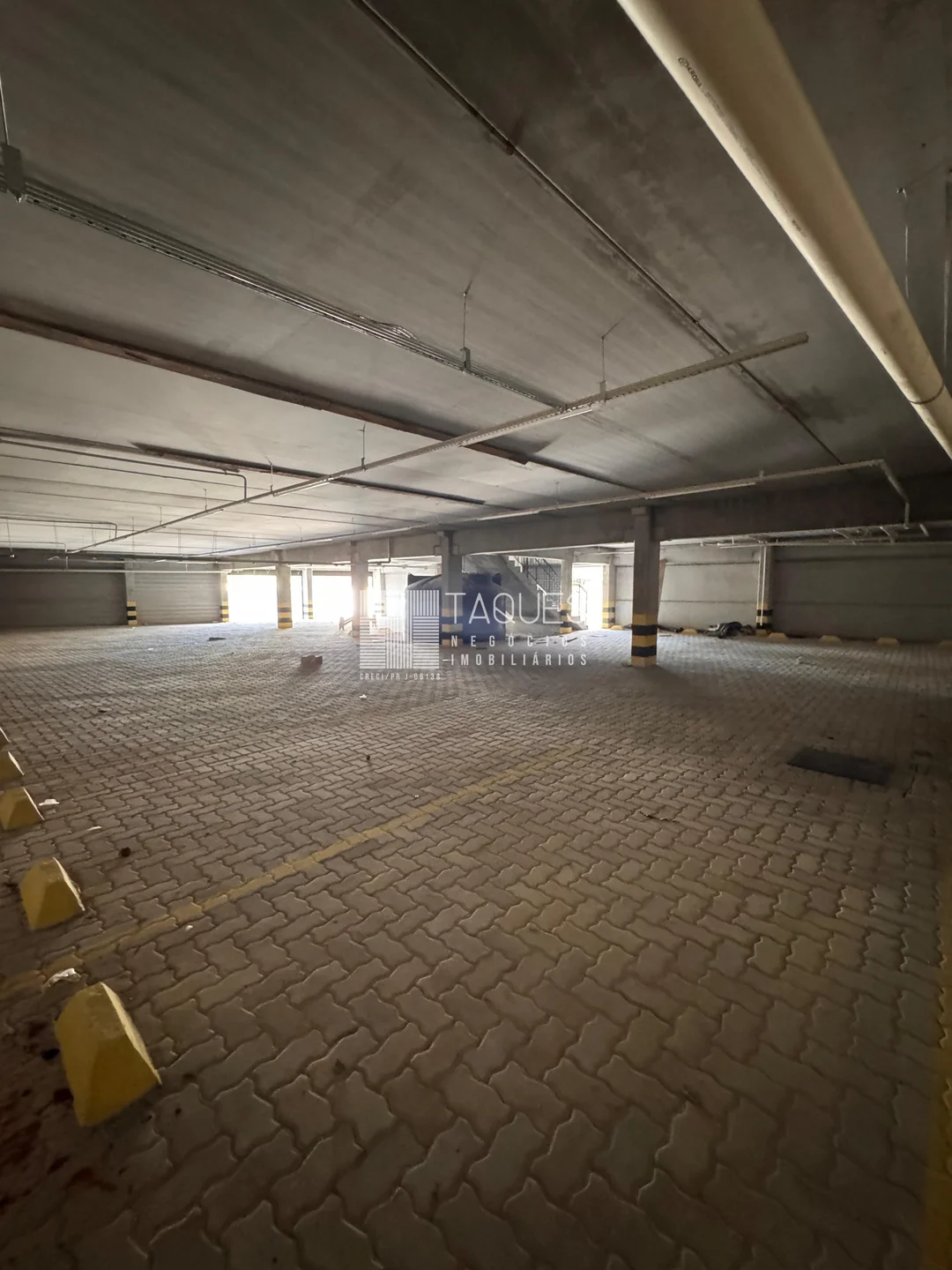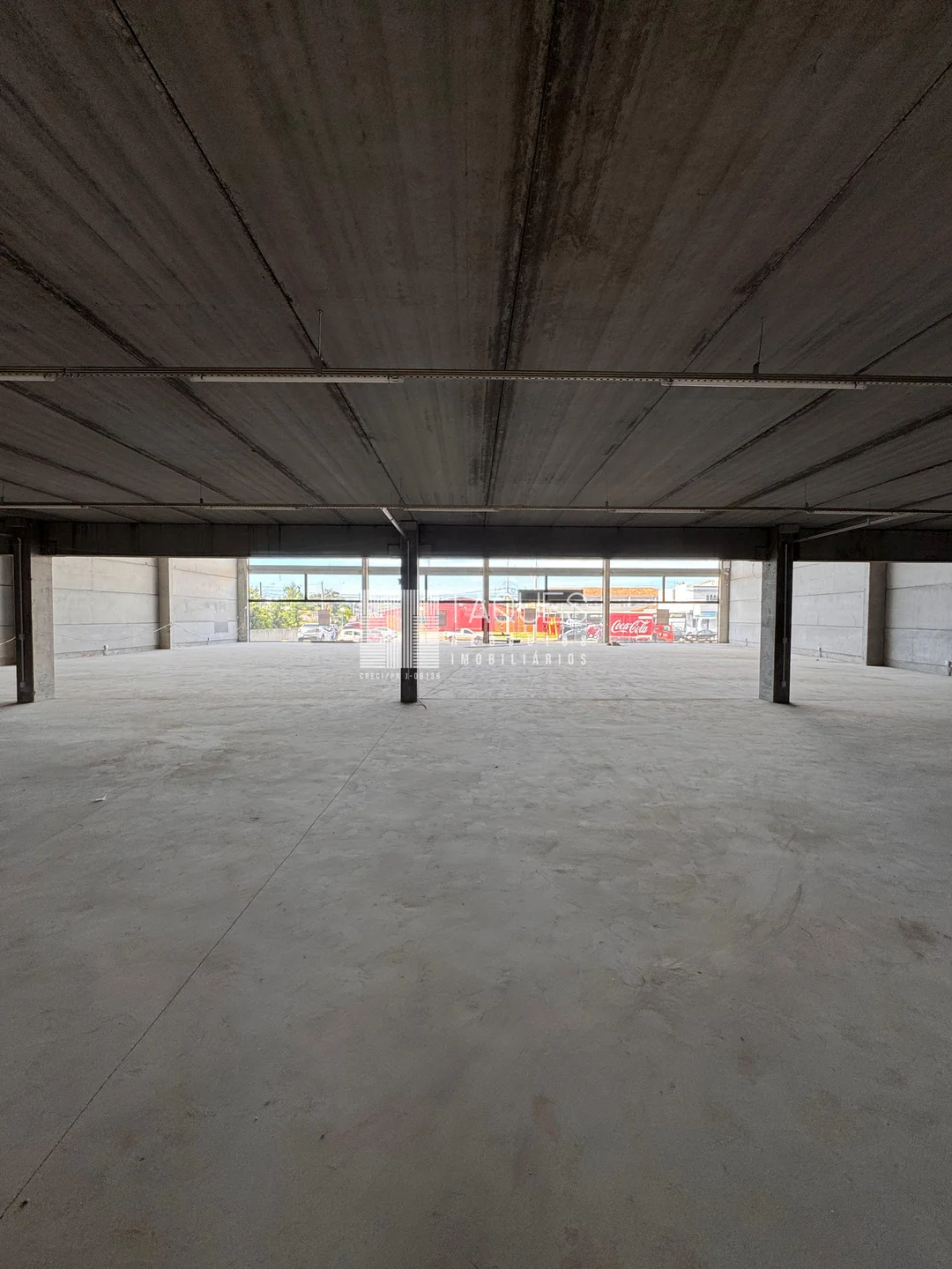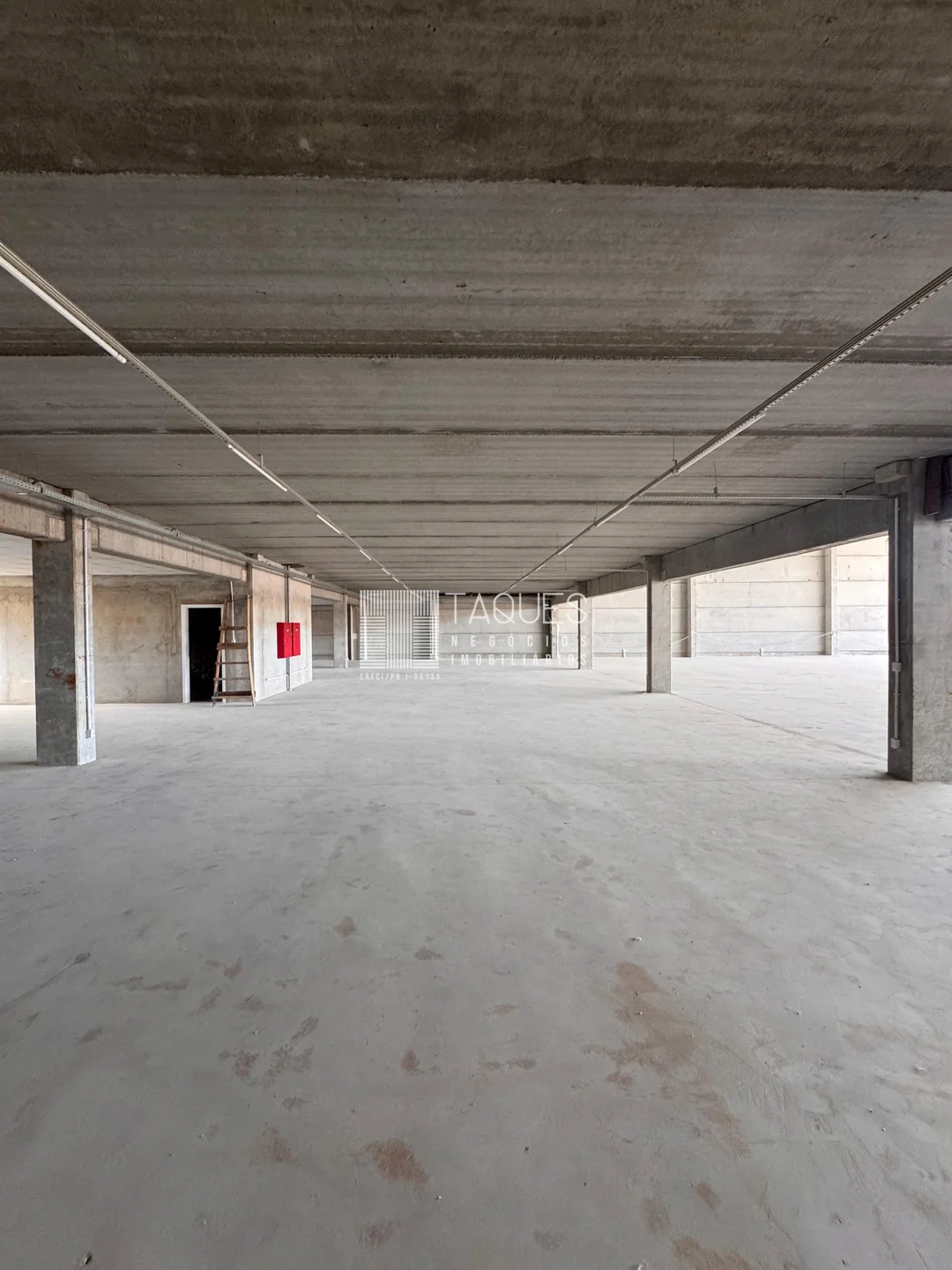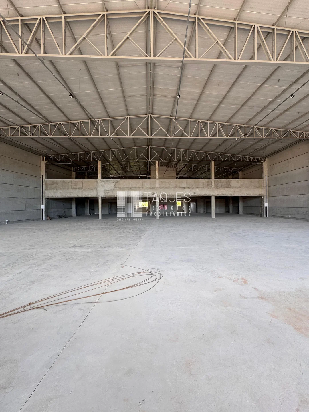 O barracão tem de área total 1589m2, divido em três pisos: No piso térreo contamos com aproximadamente 907m2, com banheiros masculino, feminino, banheiro com acessibilidade e 2 copas. No piso inferior contamos com diversas vagas de garagem. Já no piso superior contamos com um mesanino com aproximadamente 446m2.