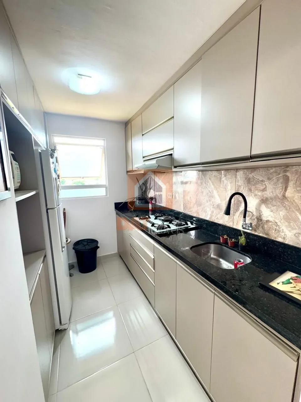 Cozinha com móveis planejados, com cooktop, exaultor e geladeira;
