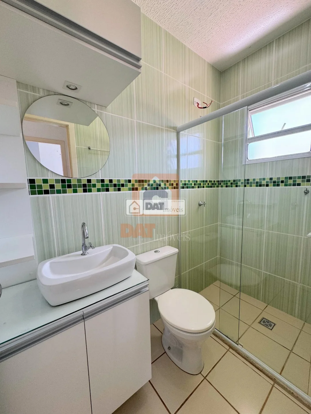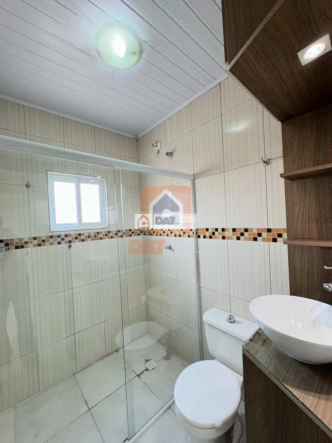 1 banheiro social com armário planejado e box em vidro;