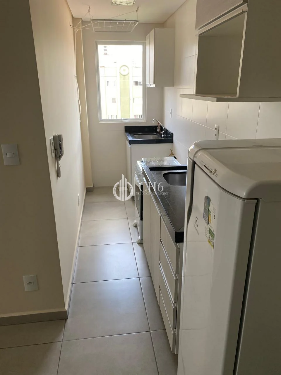 Cozinha e lavanderia com armários planejados, geladeira e fogão inclusos
