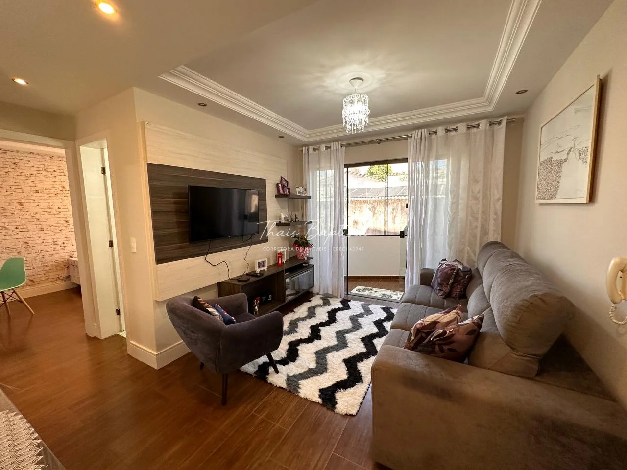 Contendo 2 quartos, sala para 2 ambientes integrada com a cozinha, sacada com churrasqueira, área de serviço, BWC social e garagem.
