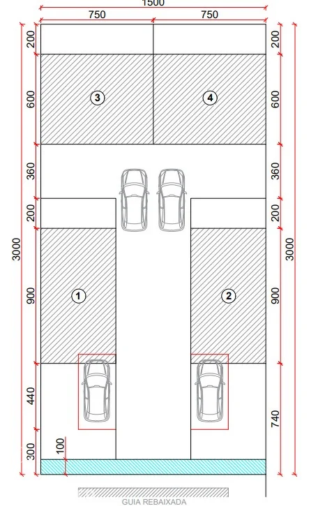 Serão duas casas na frente e duas nos fundos, sendo as de fundos com entrada conjugada mas com portão individuais, como mostra no projeto;