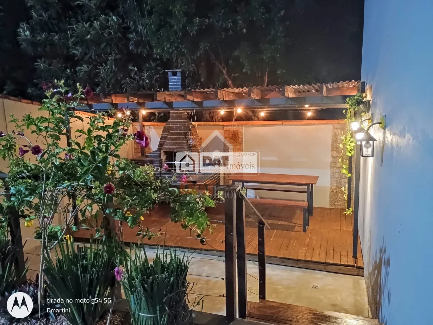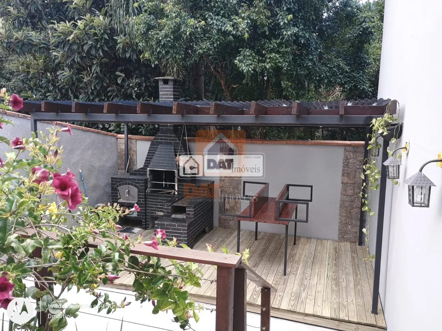 Pergolado (área coberta) com deck e churrasqueira, compondo a área de lazer;
