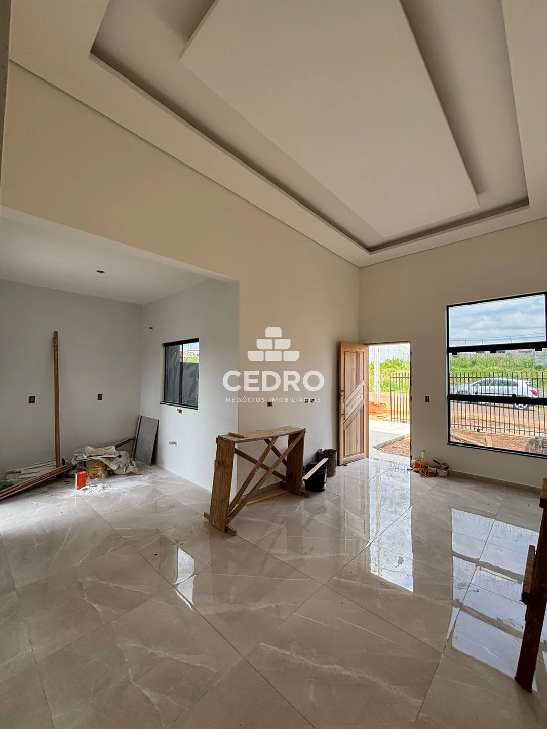 - Forro de laje com rebaixamento em gesso e pé direito duplo;