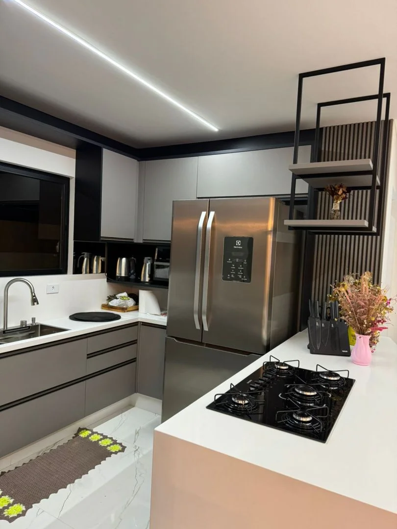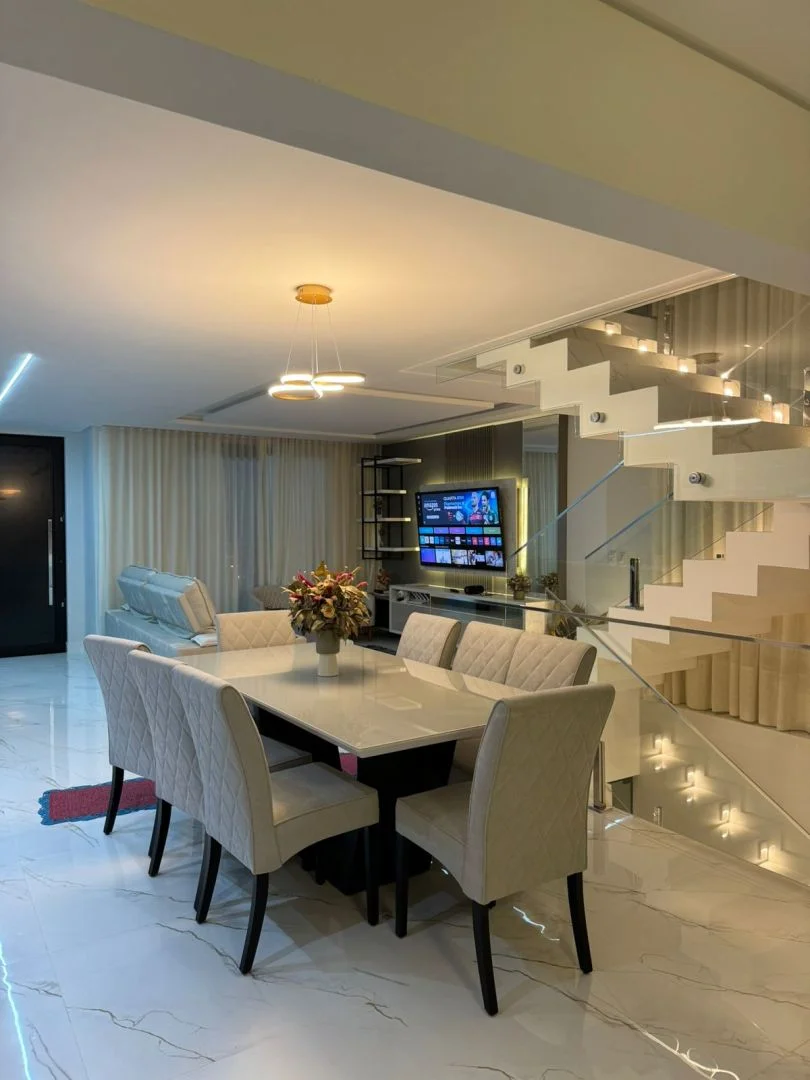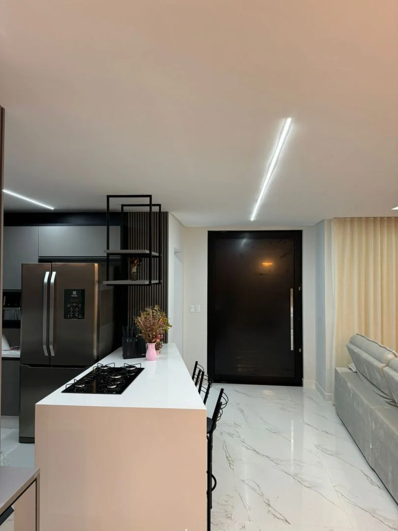 ✨ No pavimento térreo, a casa conta com living integrado, unindo sala de estar, sala de jantar e cozinha em um ambiente moderno e acolhedor.