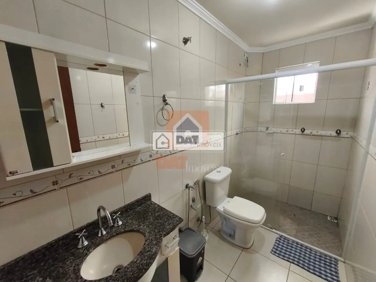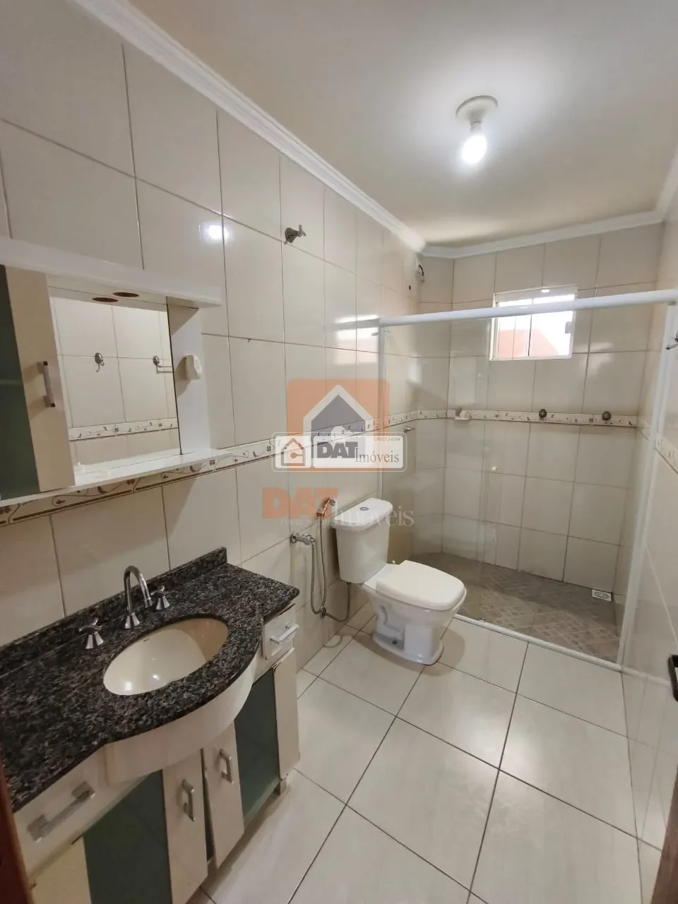 Banheiro social com armário e box em vidro;