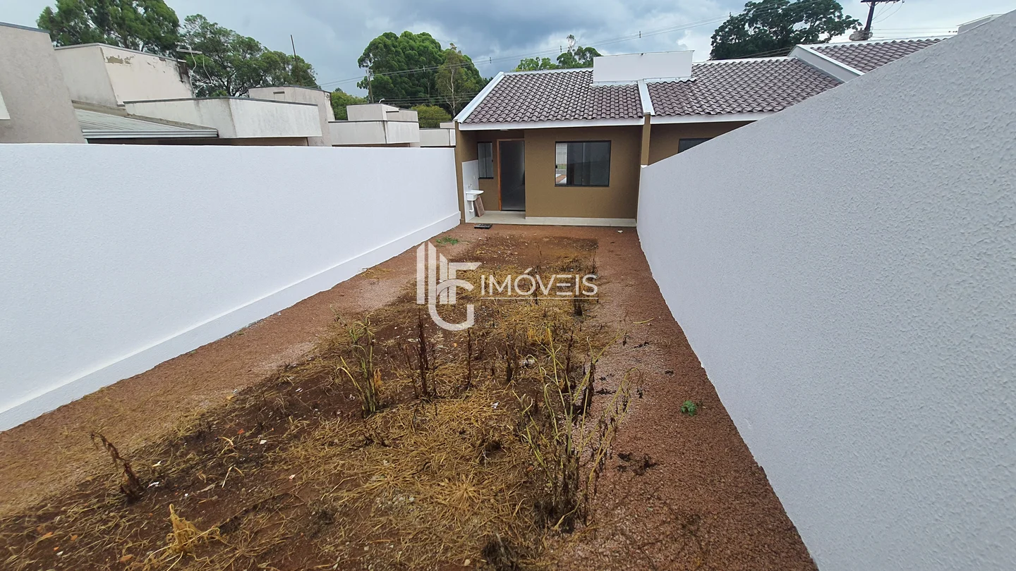 Casas a venda com aproximadamente 50 m² contendo 2 quartos, sala, cozinha, banheiro, área de serviço, vaga de garagem. Amplo espaço de terreno nos fundos.