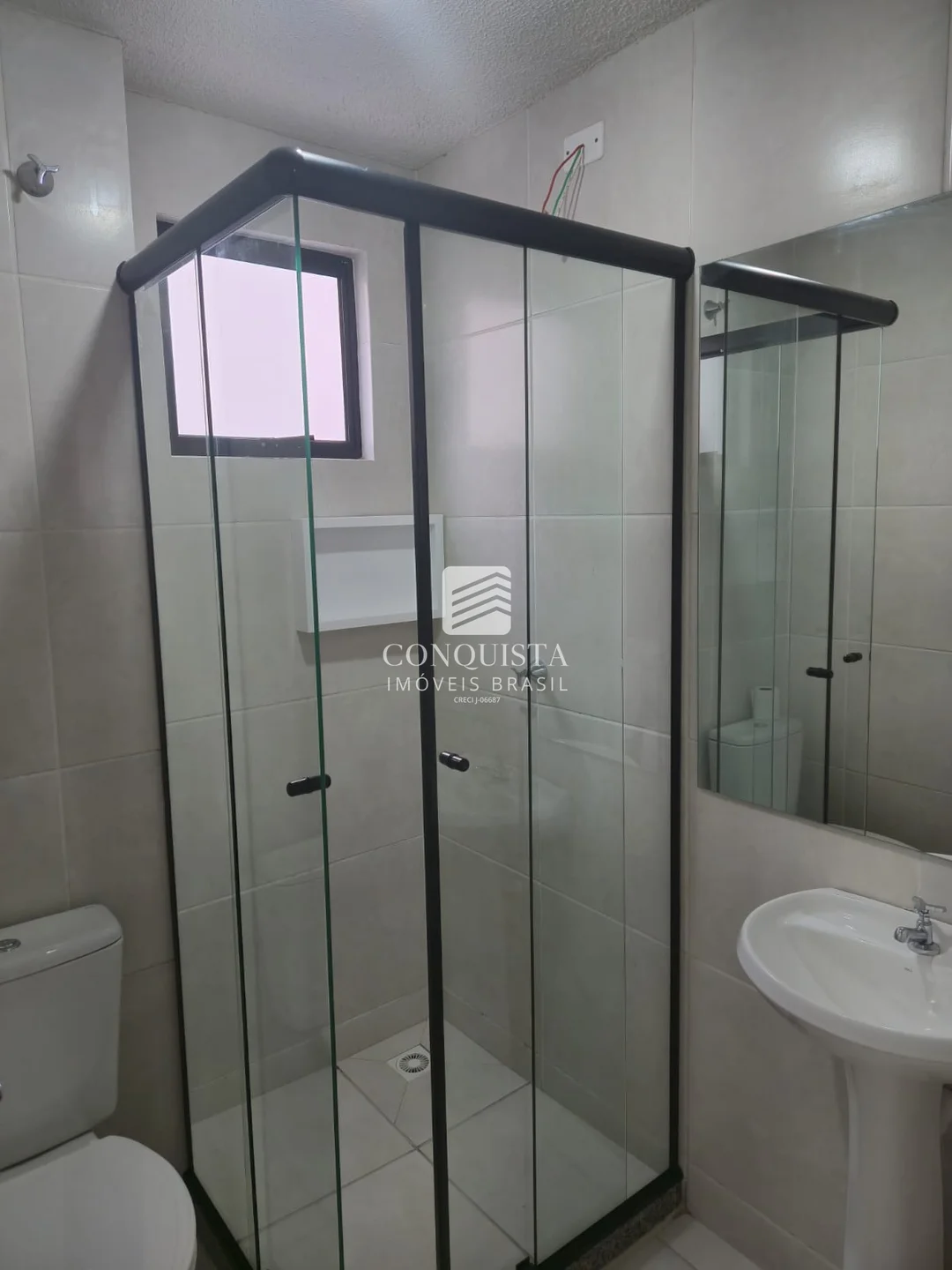 Banheiro com box em vidro e espelho