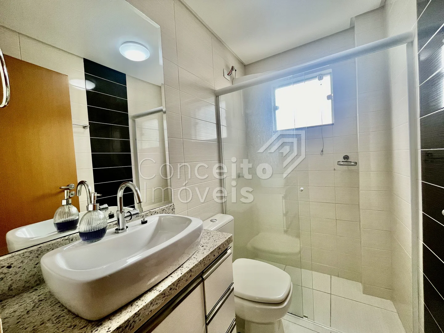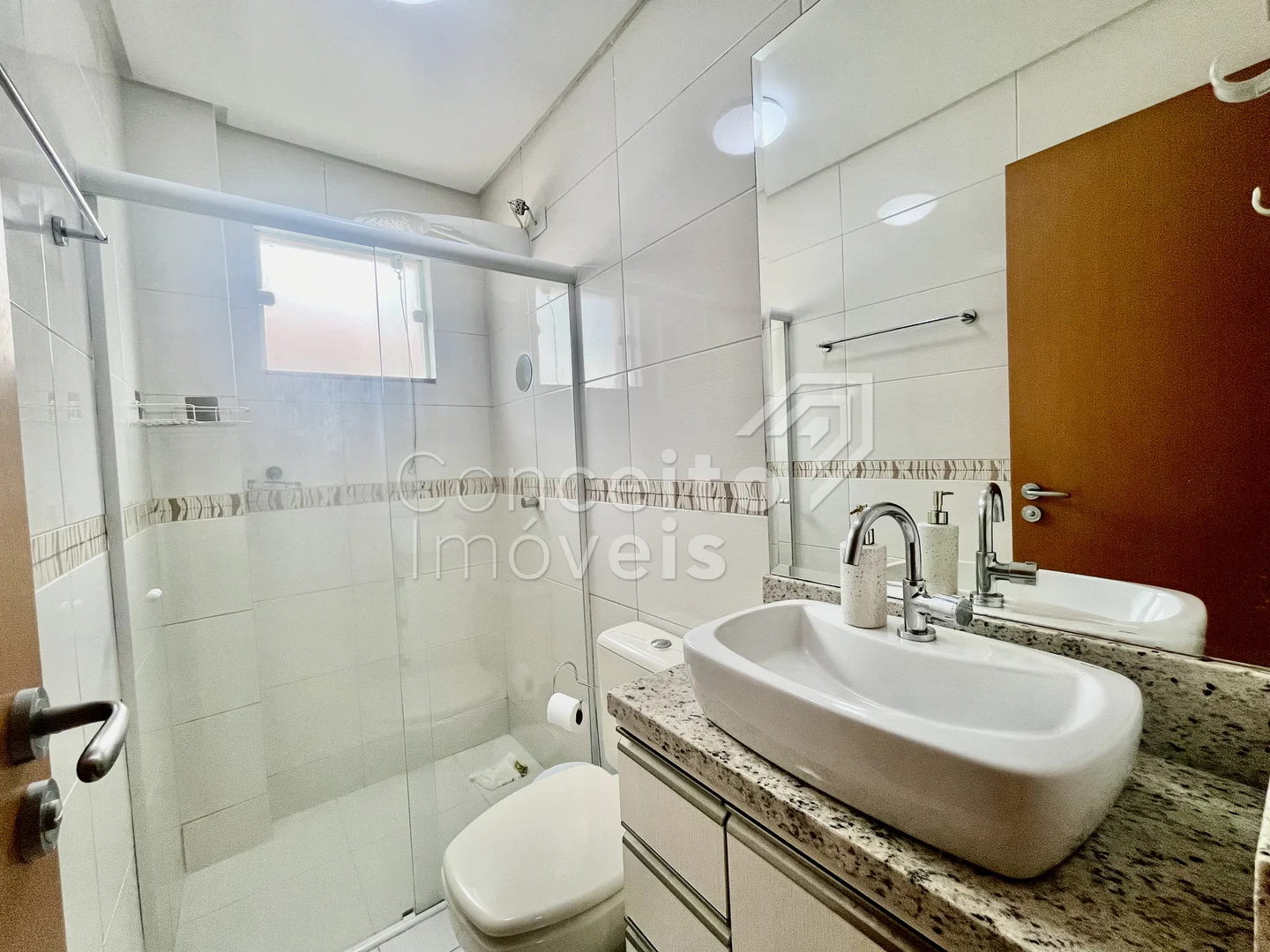 ✅ Banheiro social com armário, espelho, box e chuveiro elétrico