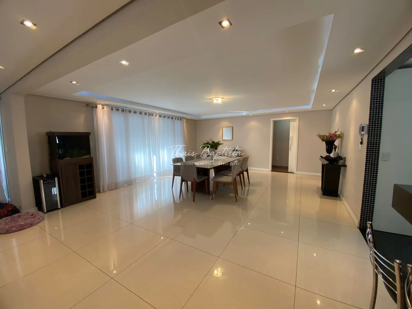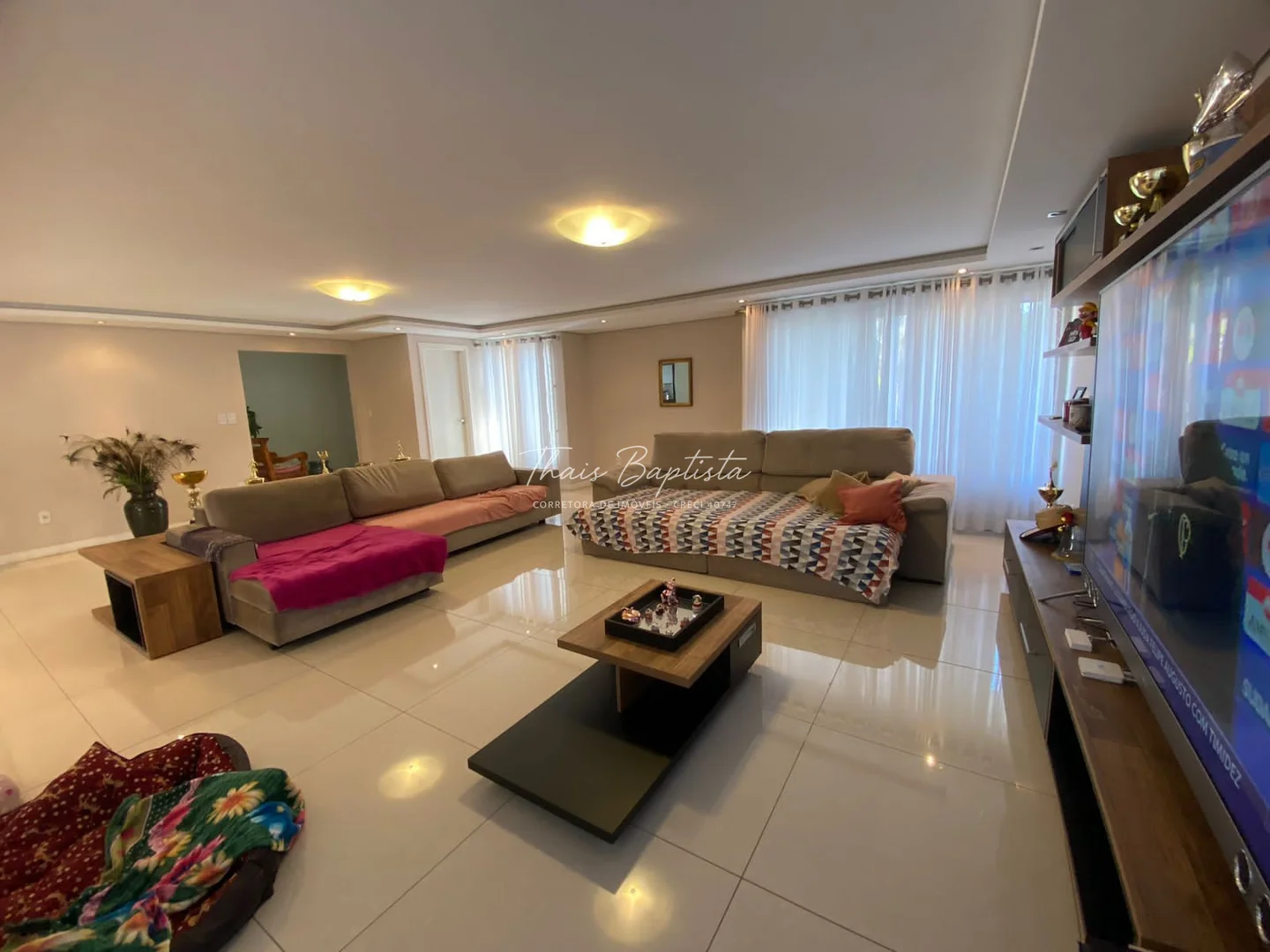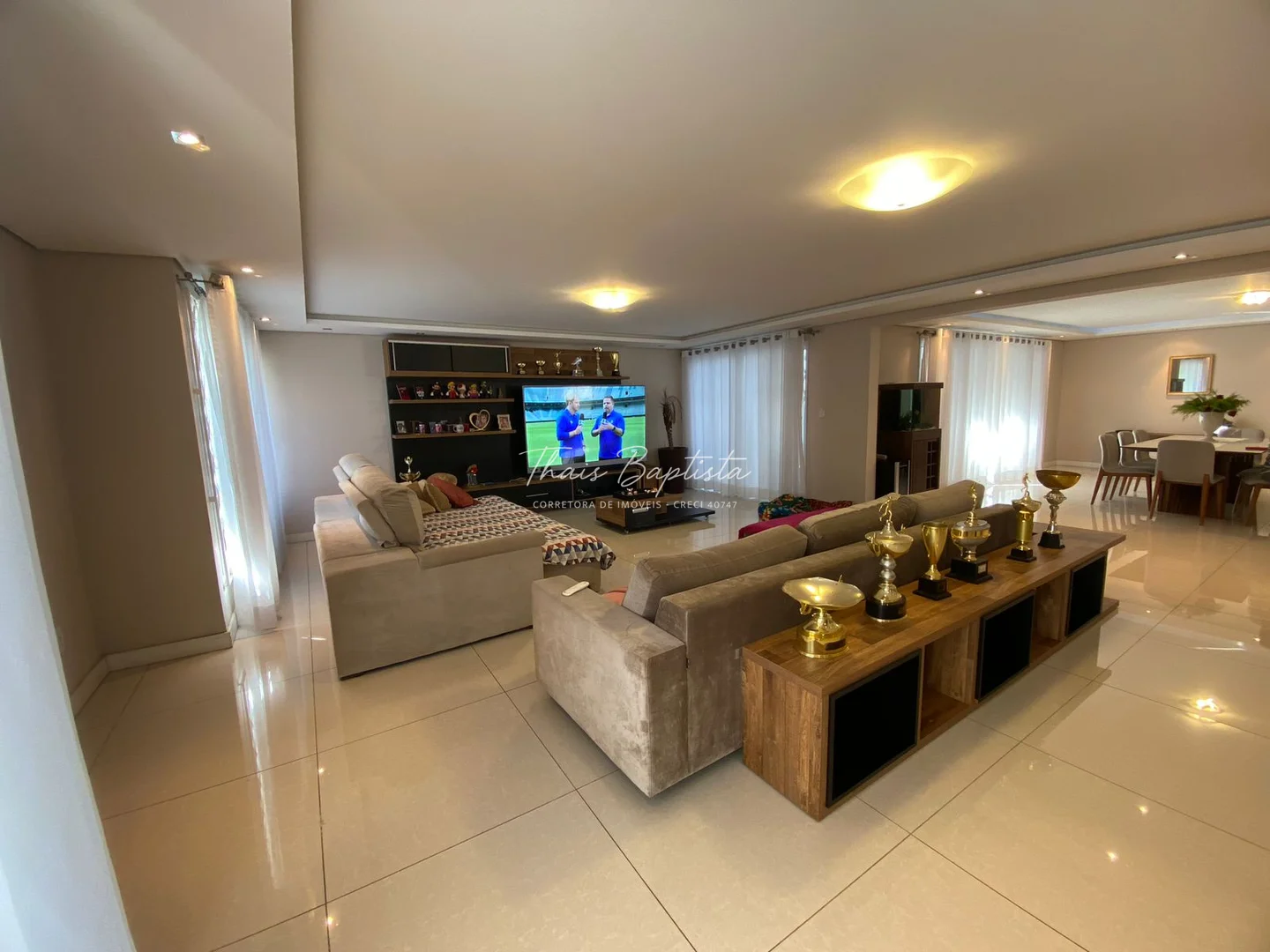 Ampla sala de estar, jantar e TV, com ambientes bem distribuídos