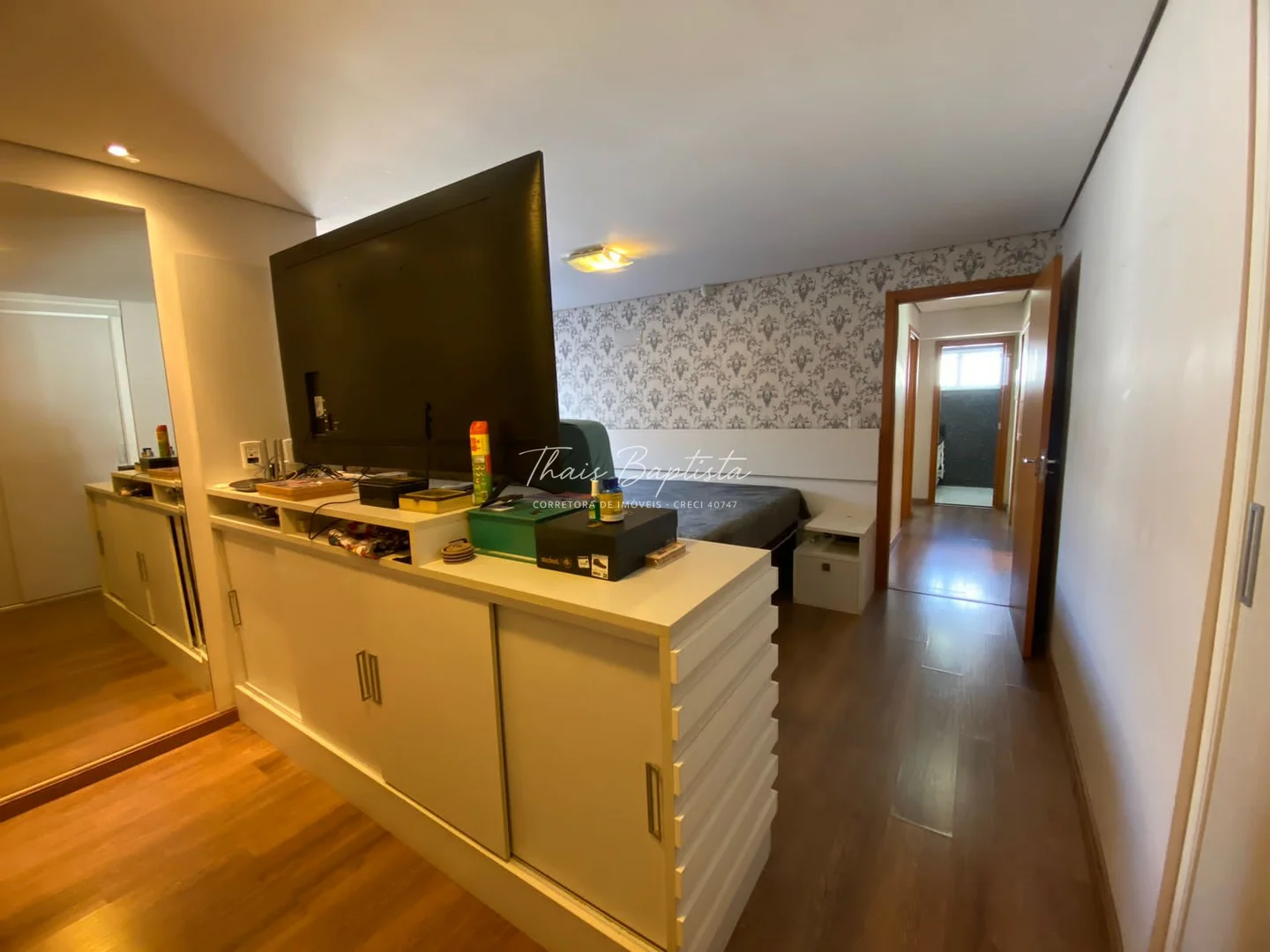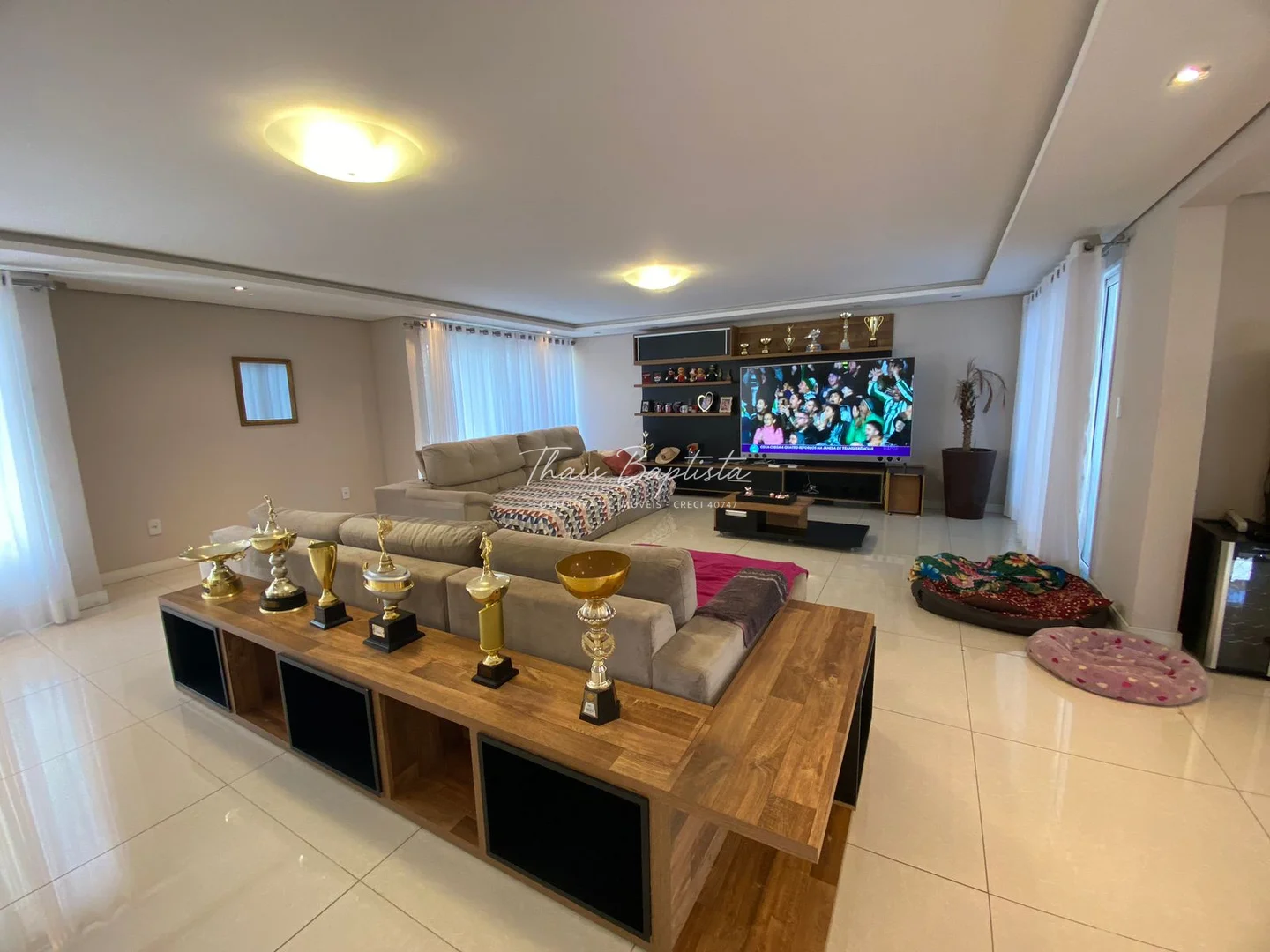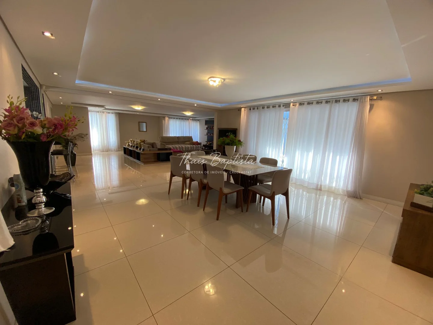Ampla sala de estar, jantar e TV, com ambientes bem distribuídos