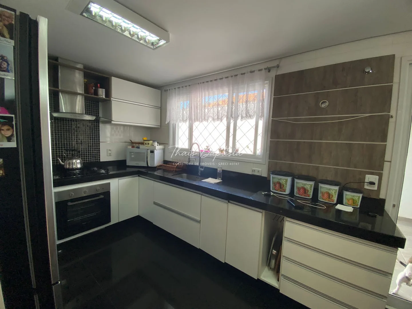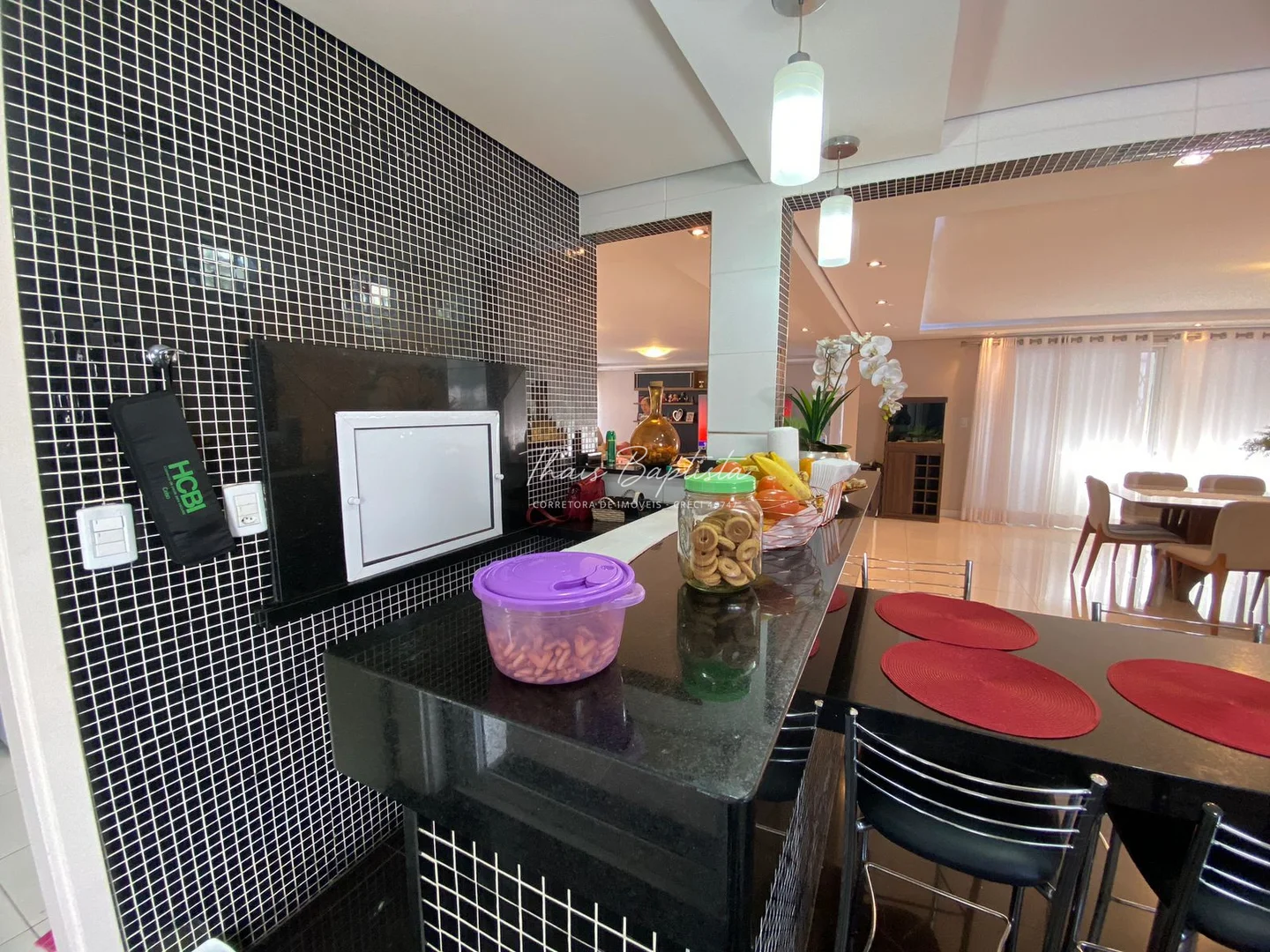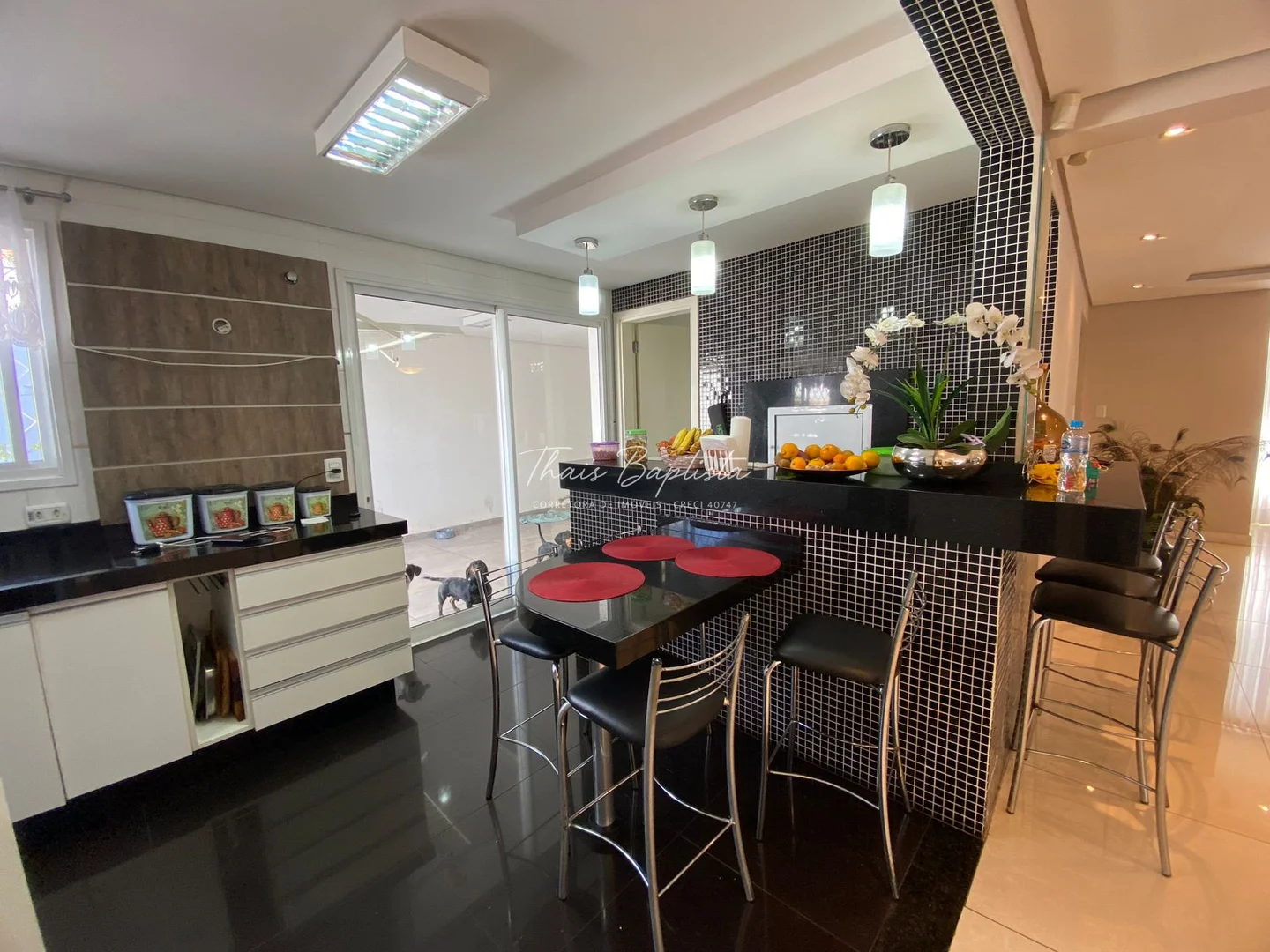 Cozinha estilo americano, equipada com armários planejados e churrasqueira integrada