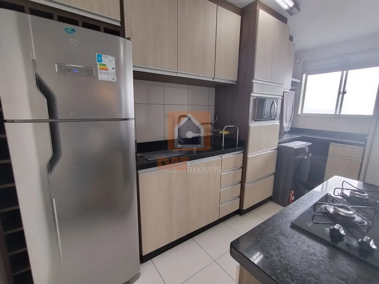 Cozinha planejada com móveis e eletrodomésticos (geladeira, fogão, micro-ondas, exaustor, talheres, panelas, louças e copos);