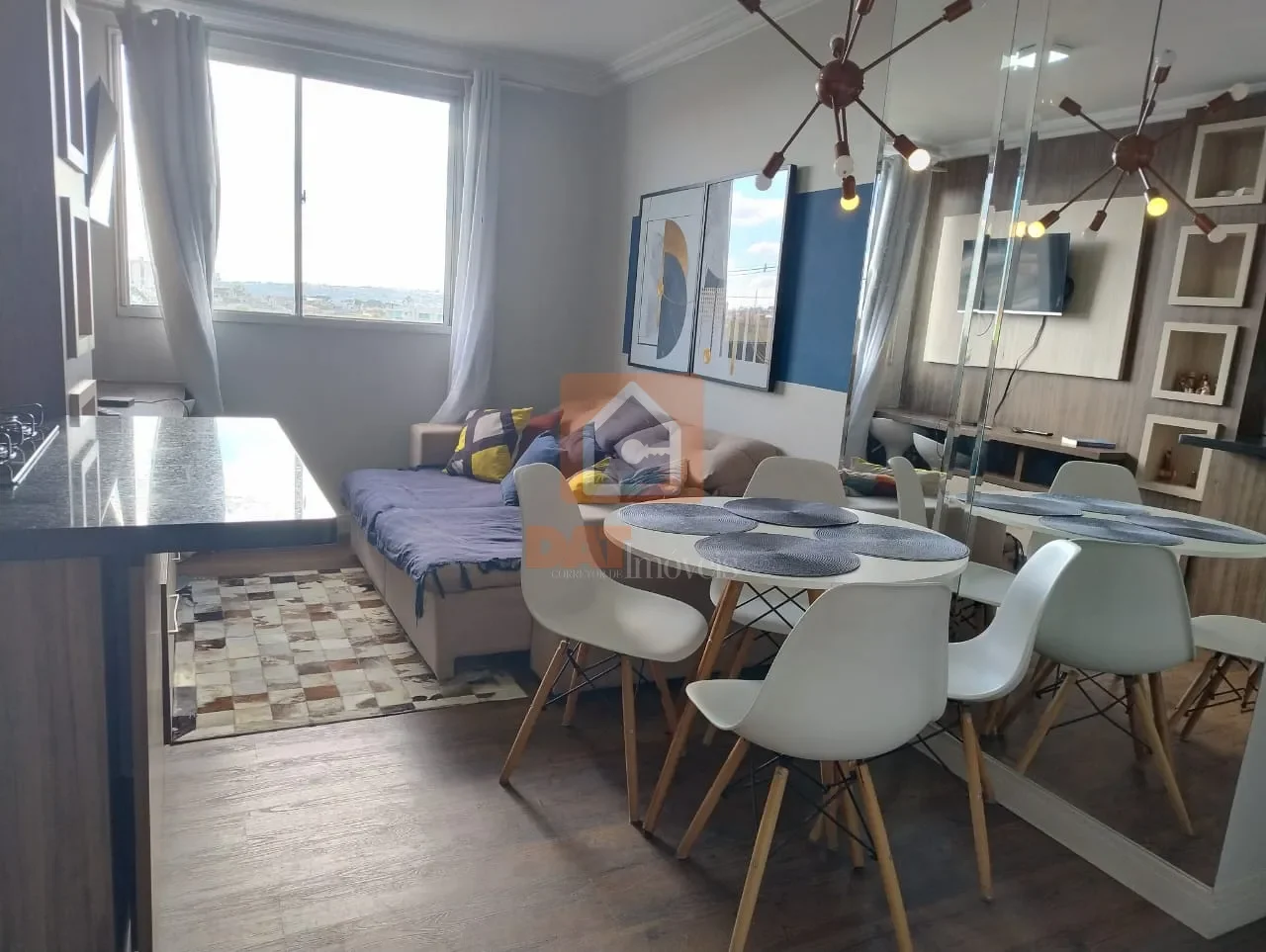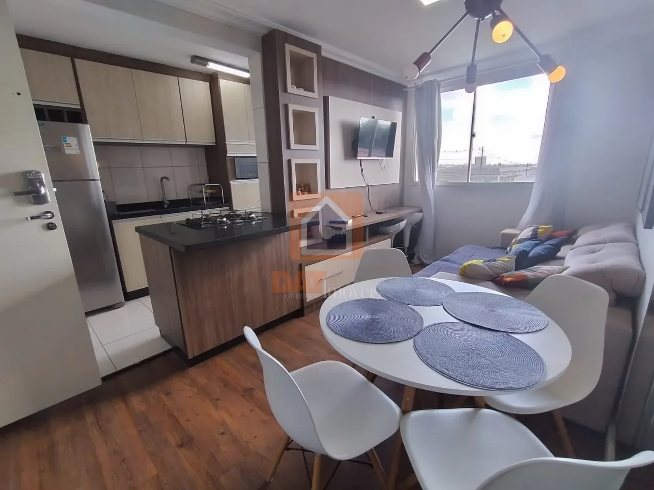 Possui sala de estar e jantar completa, com televisão, mesa e cadeiras;