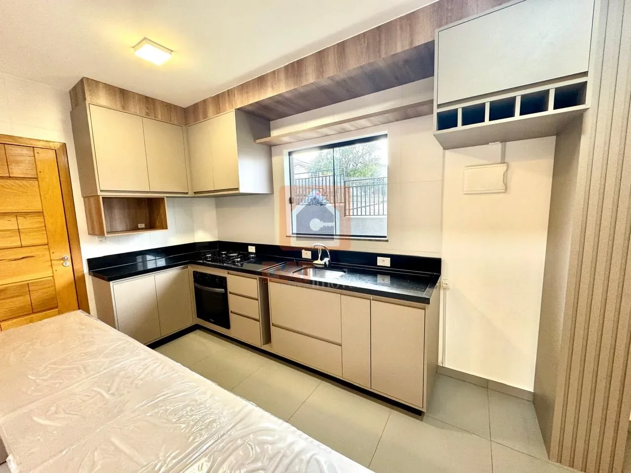 Cozinha com móveis planejados, cooktop e forno elétrico;