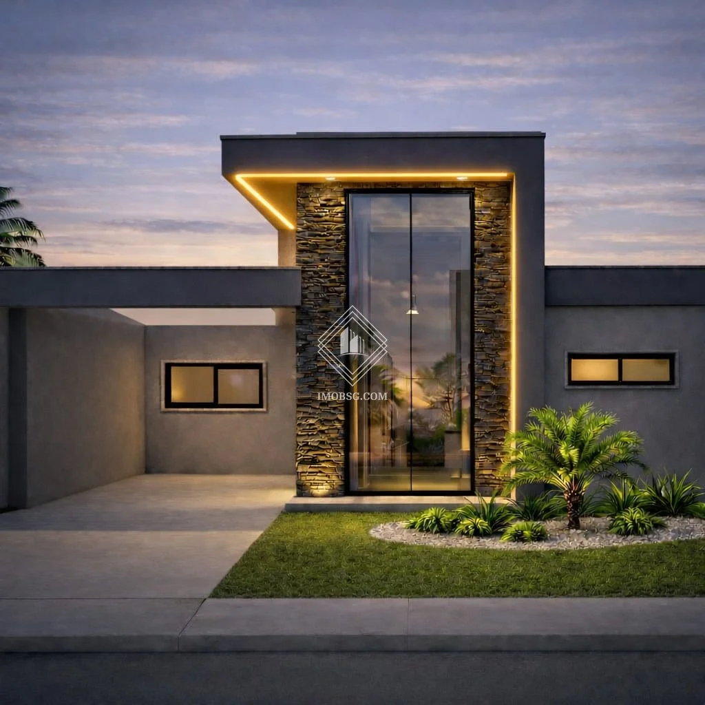 Fachada em pedra ferro, que valoriza ainda mais o design contemporâneo do imóvel.
