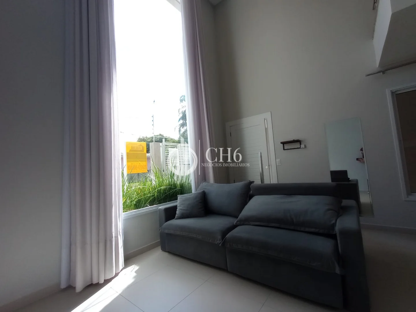 * Sala de estar com sofá e pé-direito duplo