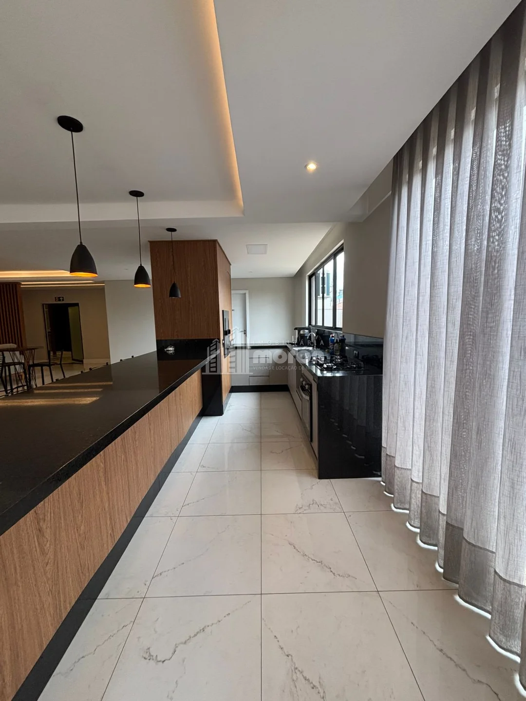 - Cozinha com móveis planejados, cooktop, coifa e churrasqueira