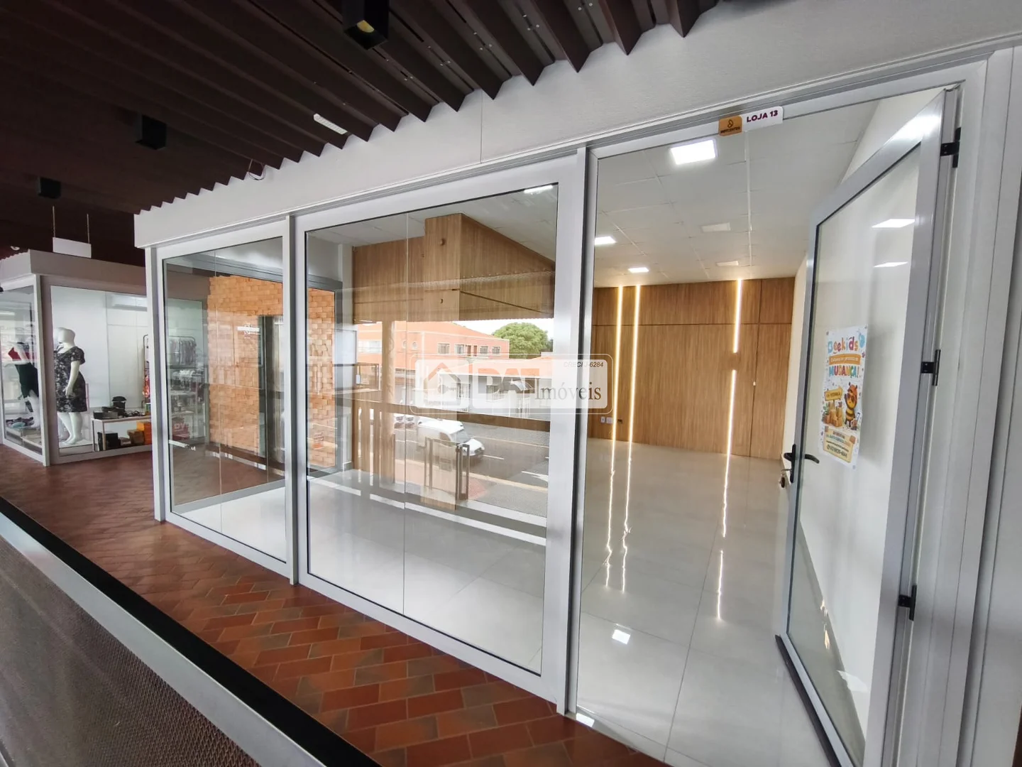 Paredes toda em madeira com iluminação, vidros nas laterais, lugar para estacionamento.