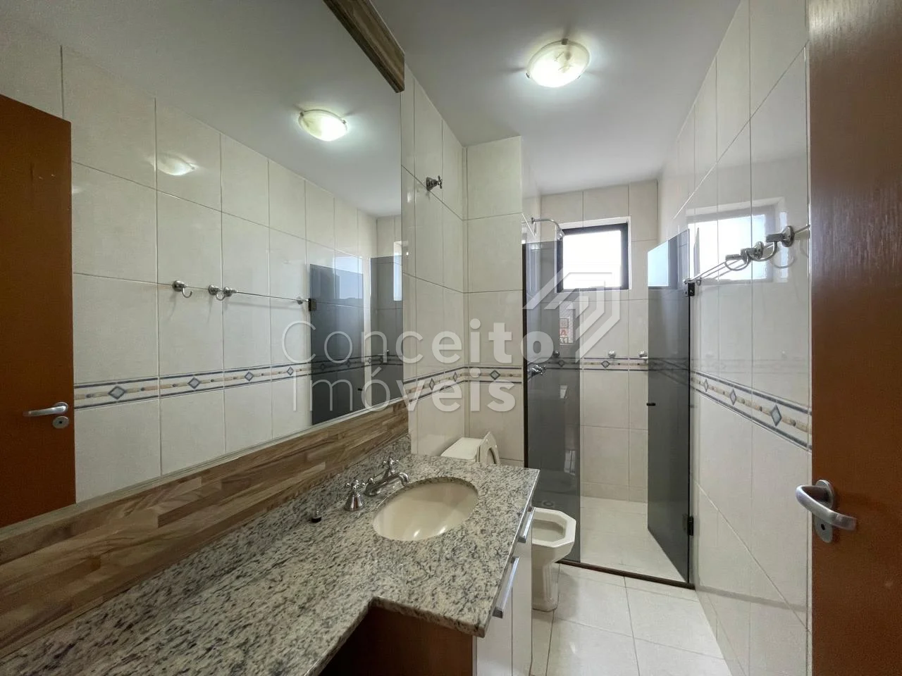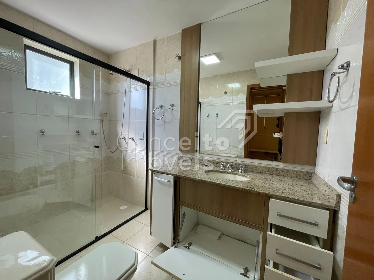 ✔️ Banheiro social com armário, espelho, box e chuveiro a gás