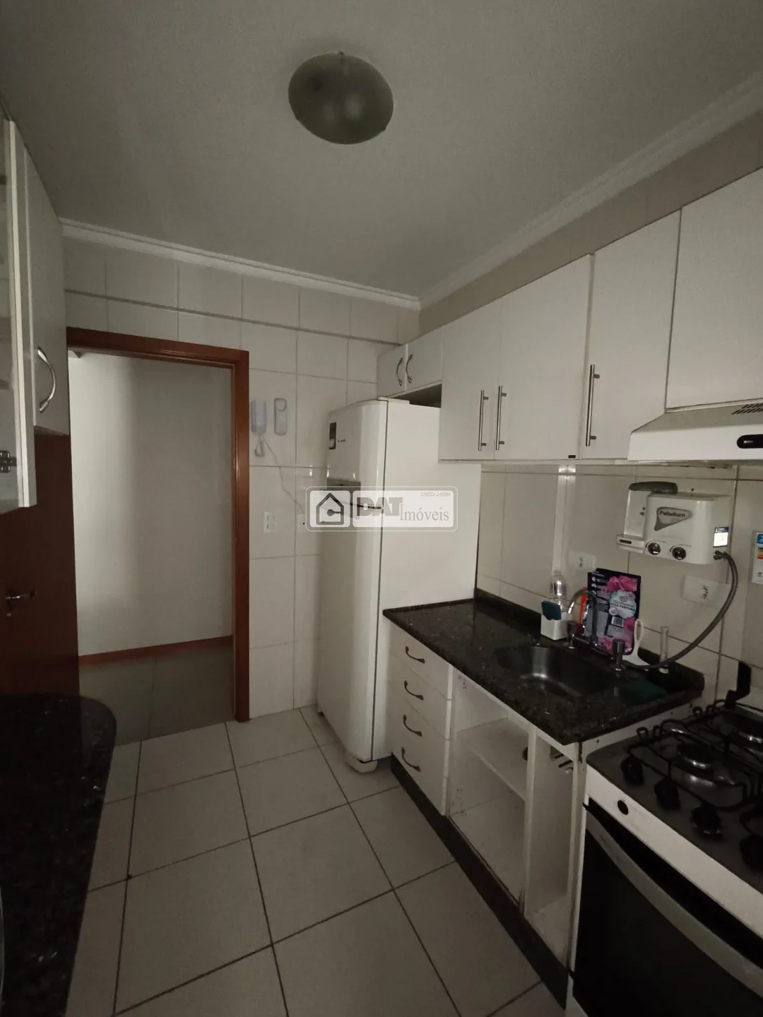 Cozinha mobiliada com armários, geladeira, fogão;