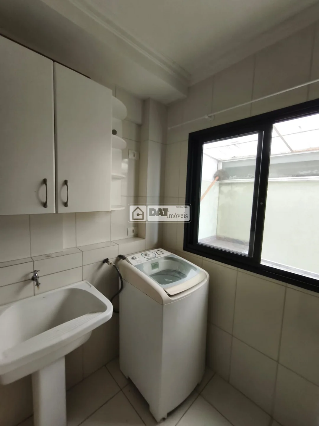 Lavanderia com armários e máquina de lavar;