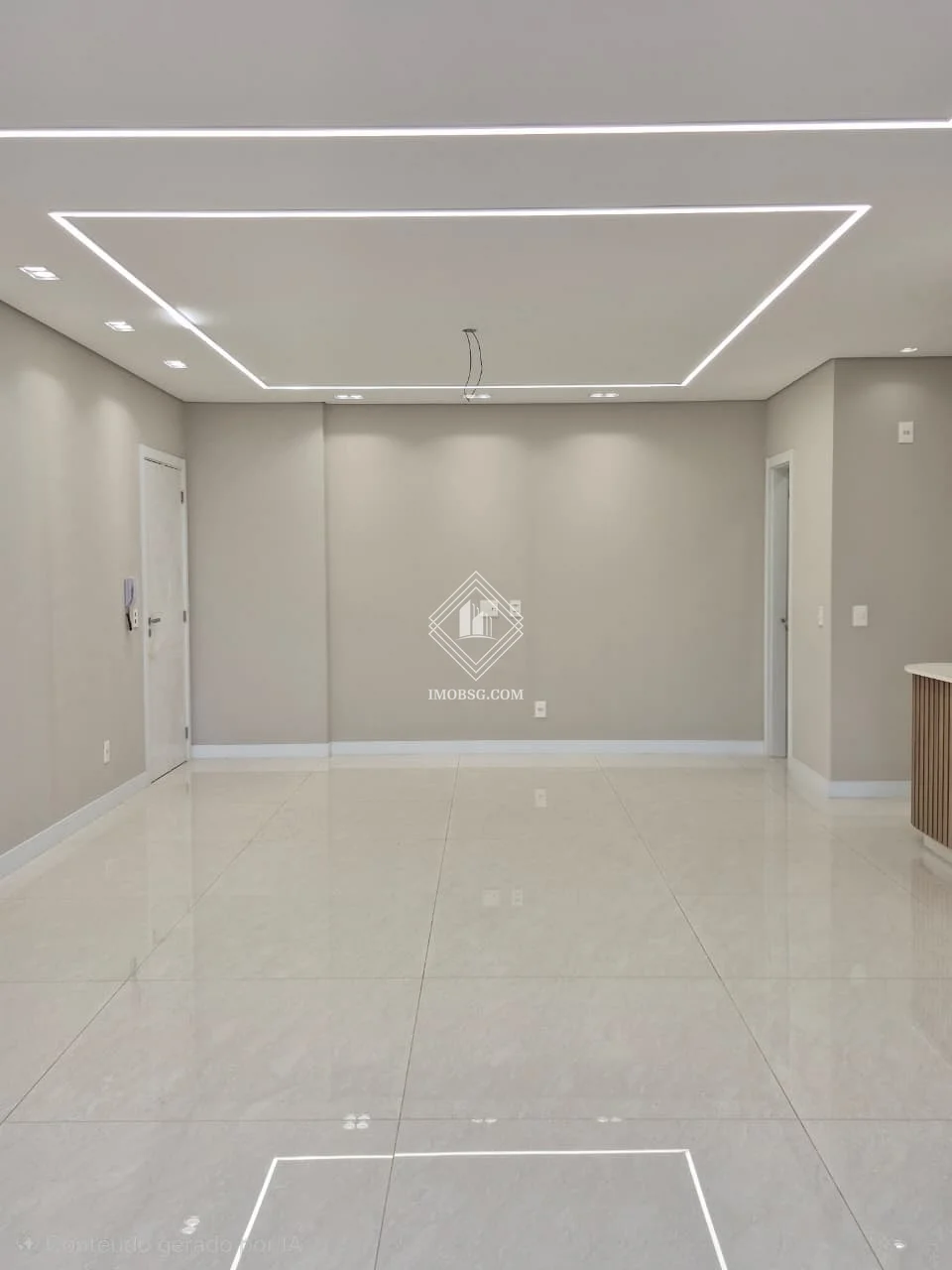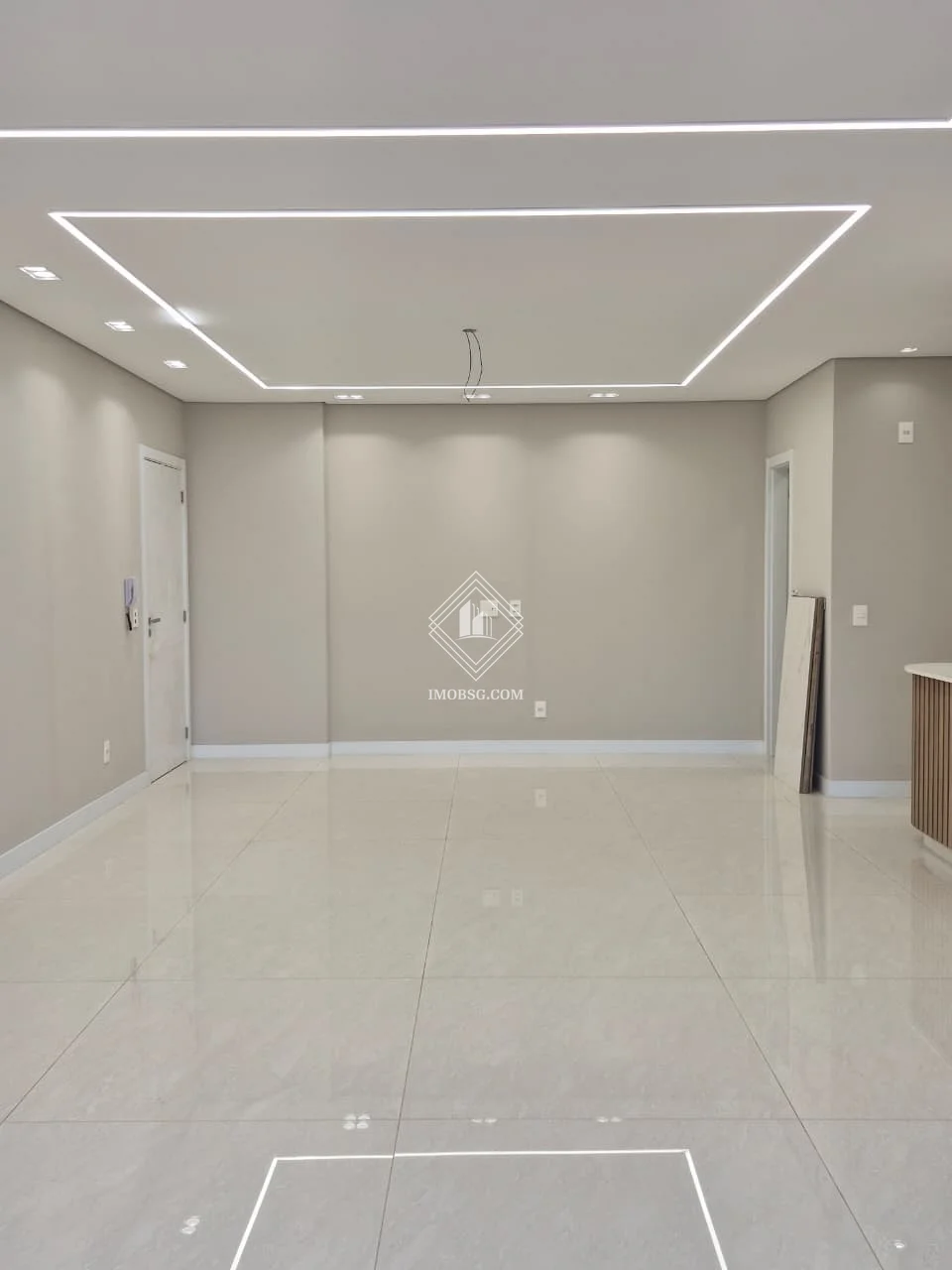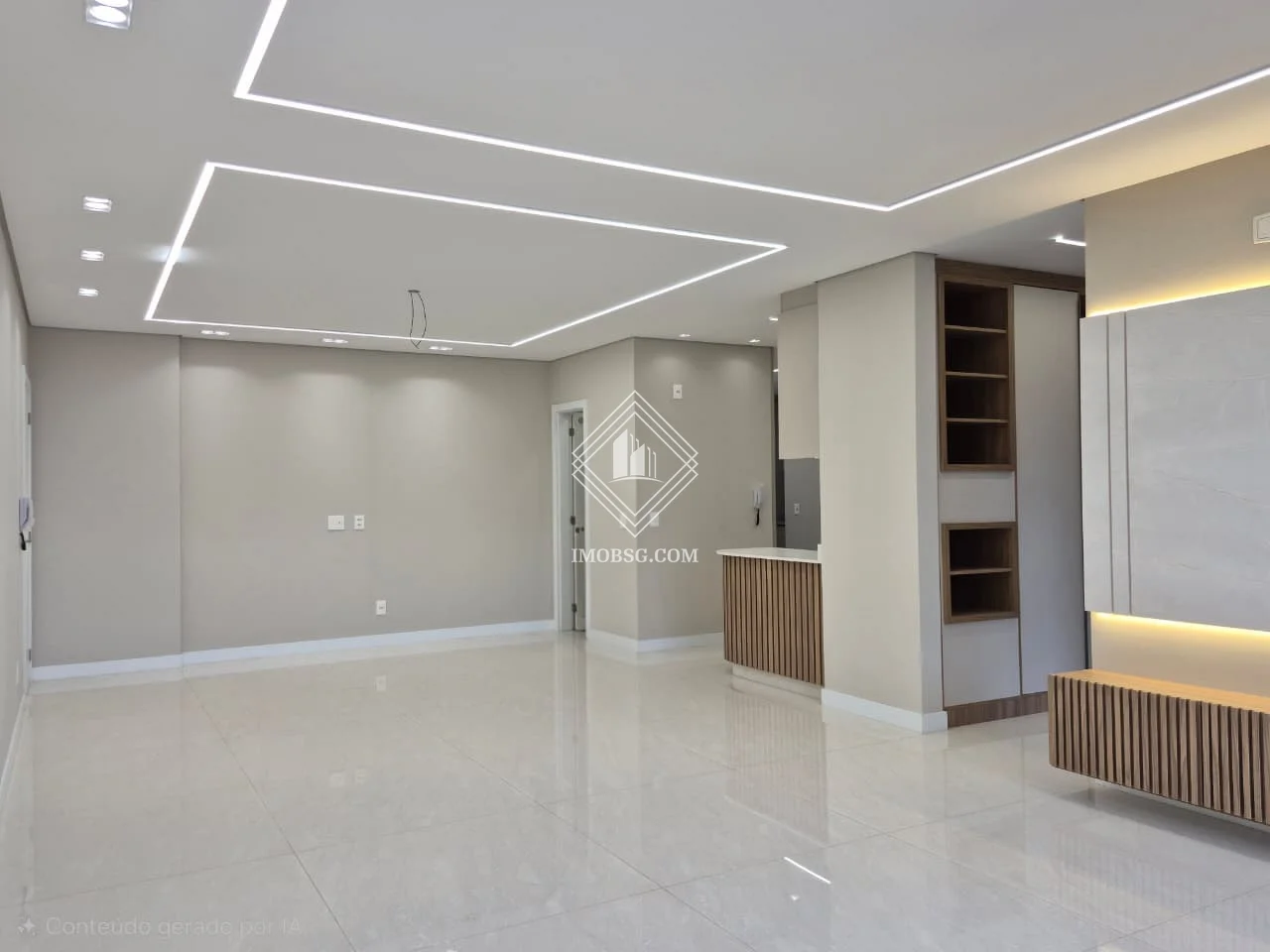 - Sala de estar integrada com sala de jantar, com painel planejado