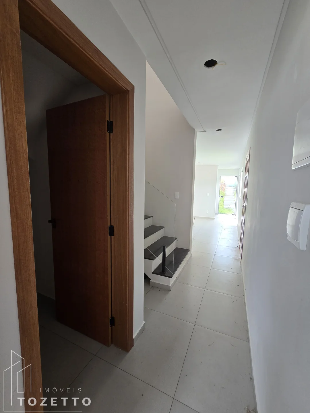 - Piso inferior: Ampla sala de estar individual, lavabo, cozinha com preparação para ilha, também individual, área de serviço separada, fechada e e coberta, piso todo revestido em porcelanato. Há 3 entradas: sala, cozinha e área de serviço.