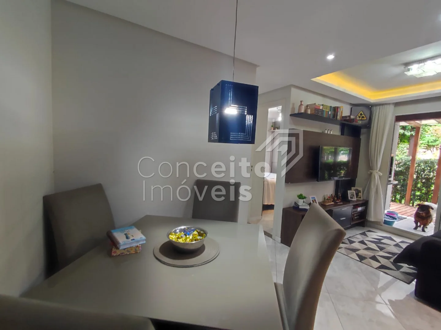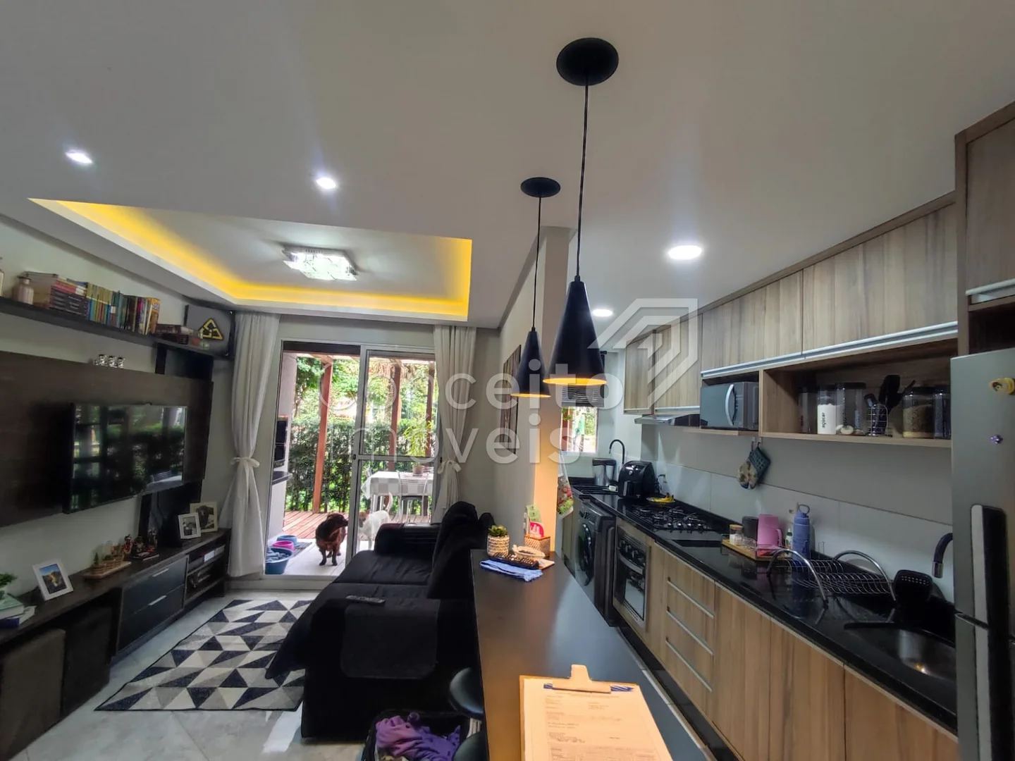 ✅ Sala e copa integradas, com painel de TV e rebaixamento em gesso, trazendo mais iluminação e sofisticação
